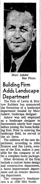 Stationed in England, near East Anglia during WWll. Askew noticed "bathing pools" here which influenced swimming pool designs later on in his career. (Dick Tracy, Sac Bee, April 30, 1994)