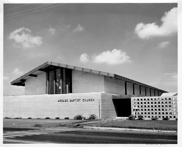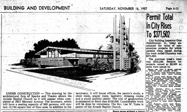 "UNDER CONSTRUCTION - This drawing by the architectural firm of Sparks and Thaden shows the Arcade Baptist Church as it will appear when completed at 3927 Marconi Avenue. The structure, which will have a seating capacity of 900 persons, will contain 13,744 square feet of floor area. In addition to the sanctuary, it will house offices, the pastor's study, a choir room, prayer room, baptistry, dressing rooms and a youth activity center. The cost of construction is estimated at more than $100,000. Considerable work will be done by volunteers. The Rev. Lee W. Toms is pastor of the Arcade Baptist church."