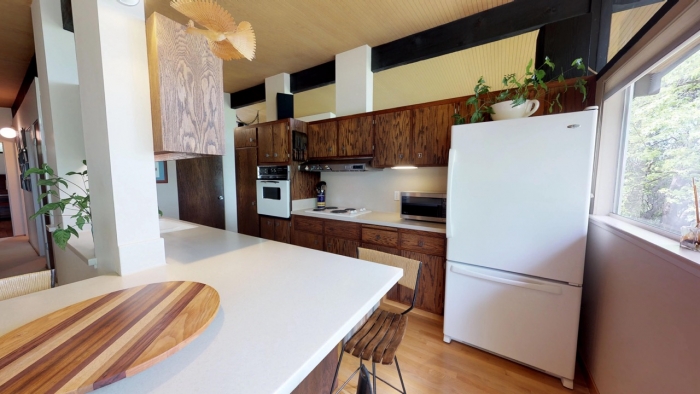 This is a rare example of an early Carter Sparks Streng Brothers Design. A slight modification of the original “601” plan, there are not many of these left in original condition. The features which make this home unique: grooved hemlock ceilings, hanging kitchen island cabinet (and all kitchen cabinets made of regional oak) and concrete block fireplace, didn’t last too long as the Streng Brothers aimed to make the homes more affordable and mostly eliminated these features.