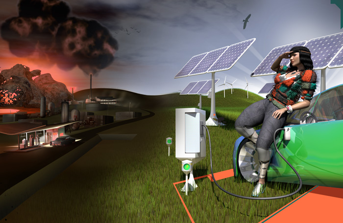 Andreas had this idea of a Edward Hopper like scene of a gas station on the left with fossil fuel oriented production, transitioning to a more slick future with alternative energy sources on the right. Throw in a future driver, and mix.