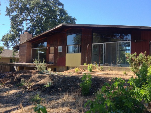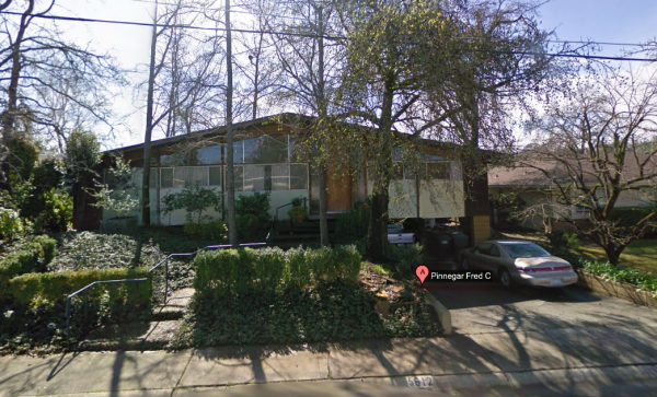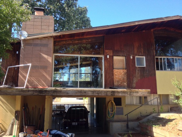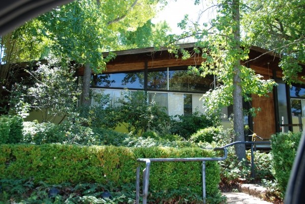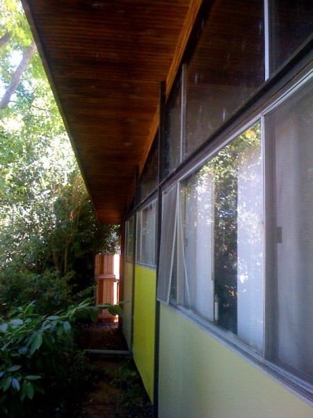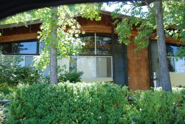 This is a house that Tony Natsoulas suggested might be a Carter Sparks (it's not). What it is though, is a wonderful residence with a drive under carport, front facade of windows, bent laminate roof beams and gorgeous 2" clear cedar tongue and groove decking.